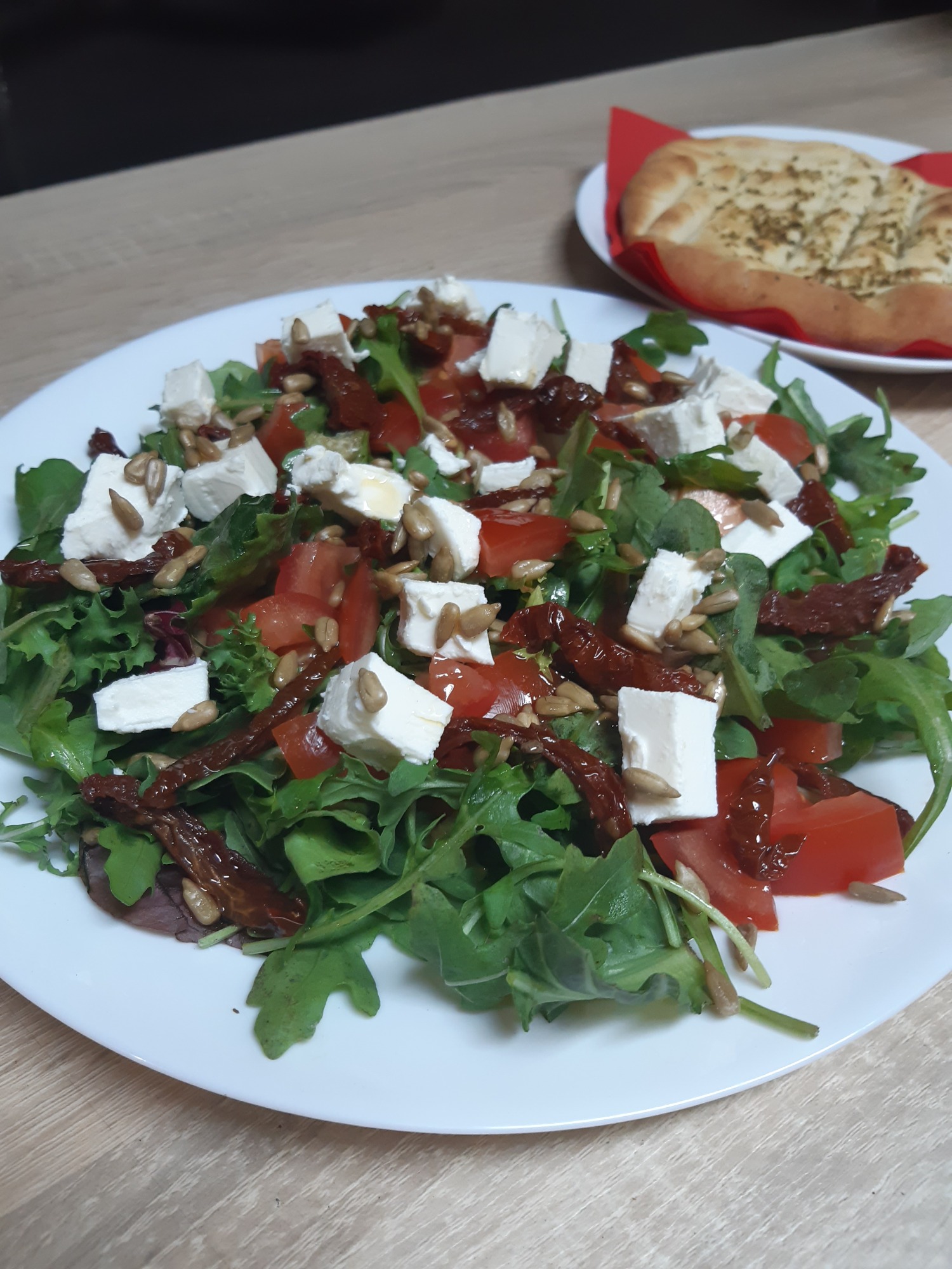 Sałatka z łososiem (mix sałat, łosoś, favita, ogórek, pomidory suszone, cebula czerwona,