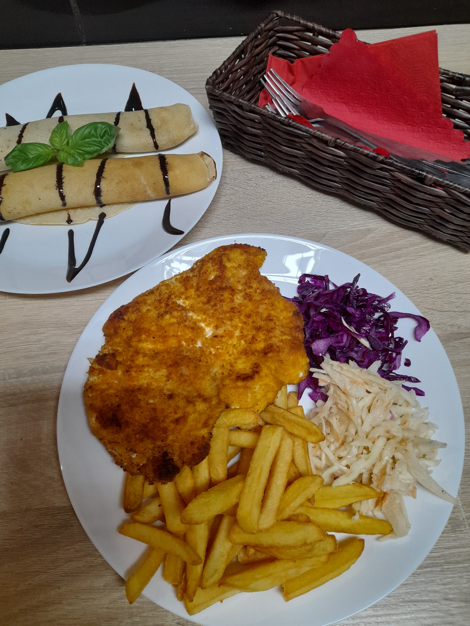 Kotlet z piersi kurczaka z frytkami i sałatką